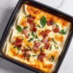 6. Bake: Cover the baking dish with aluminum foil and bake in the preheated oven for 35 minutes. Then remove the foil and bake for an additional 10 minutes, or until the egg custard is completely set and the cheese topping is melted and bubbly with slight golden spots.
