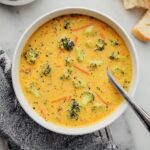 To veganize this Broccoli Cheddar Soup Recipe, substitute the dairy milk and cream with plant-based alternatives, use vegan butter, and replace cheddar cheese with a vegan cheese option. Using vegetable broth keeps the base plant-based.