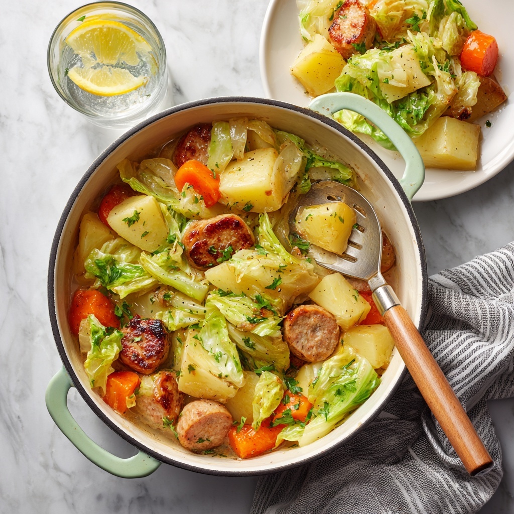 A hearty and comforting one-pan meal featuring tender cabbage, golden potatoes, and smoky sausage, perfect for a quick and satisfying dinner.