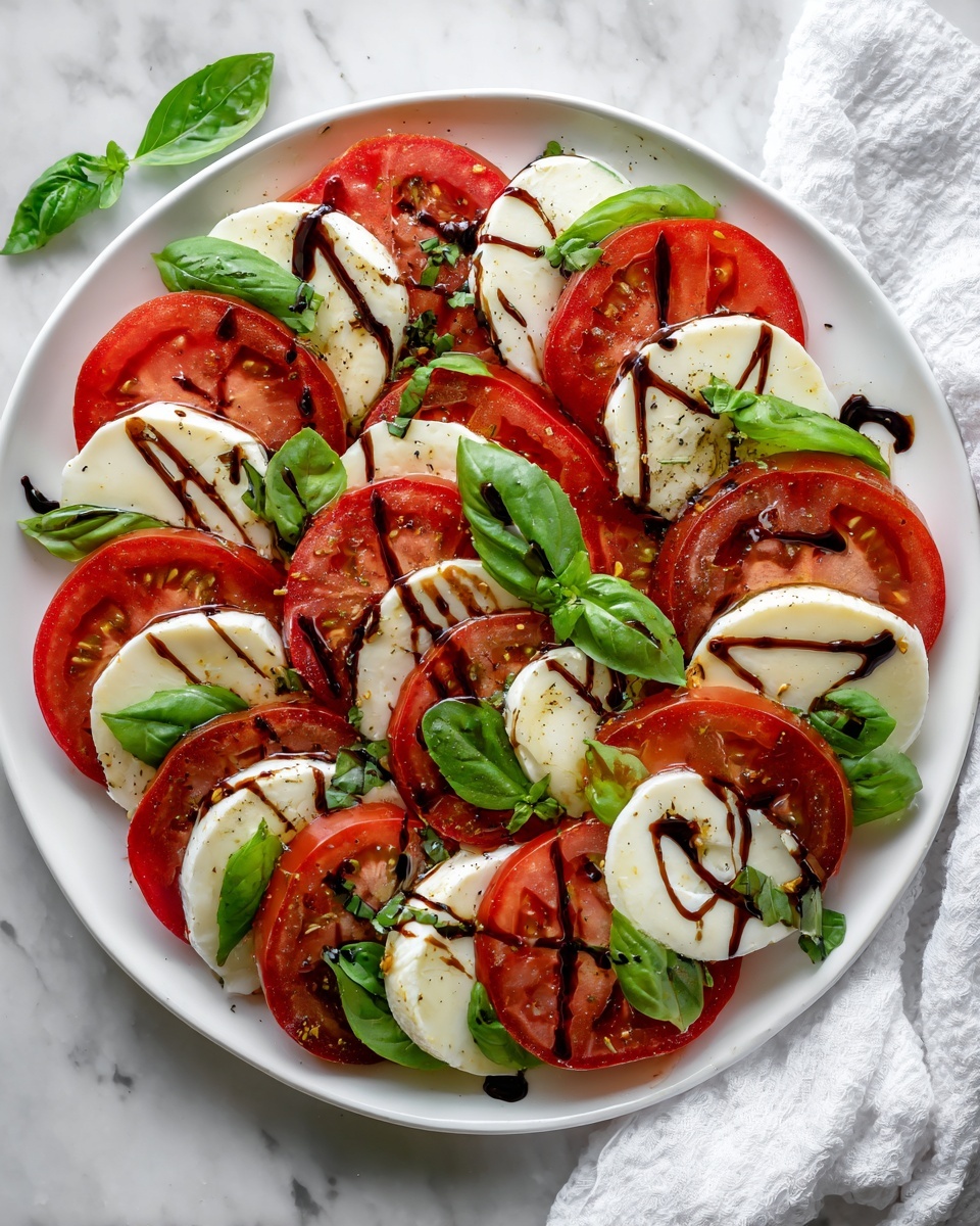 - Dress the Salad: Drizzle extra-virgin olive oil evenly over the assembled salad. Season with salt and freshly cracked black pepper according to taste. Finally, drizzle the cooled balsamic glaze generously over the entire dish.