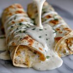 Delicious Cheesy Chicken Alfredo Wraps featuring tender seasoned chicken breast, a blend of mozzarella and cheddar cheese, all wrapped in warm flour tortillas and baked to perfection with creamy Alfredo sauce on top. Ready in just 25 minutes, this comforting dish makes for a perfect quick lunch or dinner.