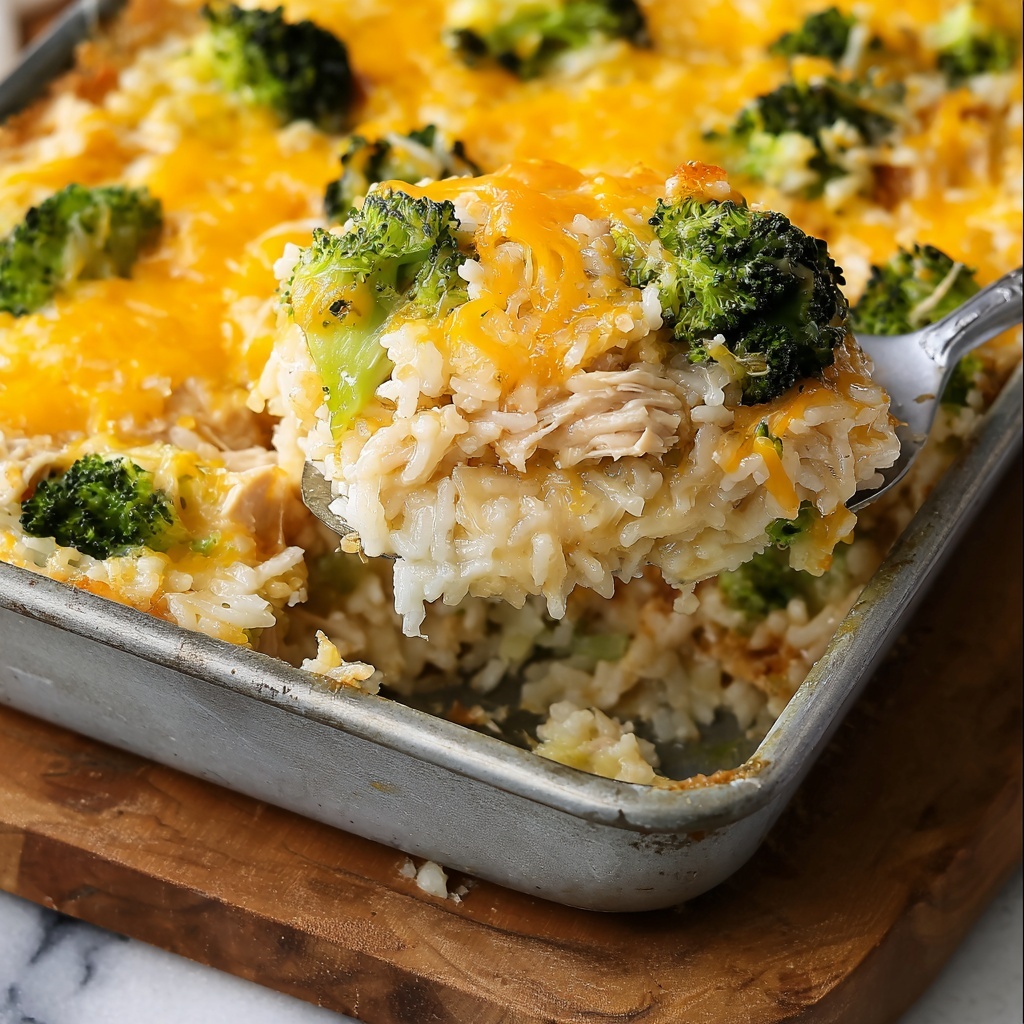 A comforting Chicken Broccoli Rice Casserole combining tender shredded chicken, steamed broccoli, and creamy cheddar cheese, all baked together in a savory mixture of rice and cream of chicken soup for an easy and delicious family-friendly meal.