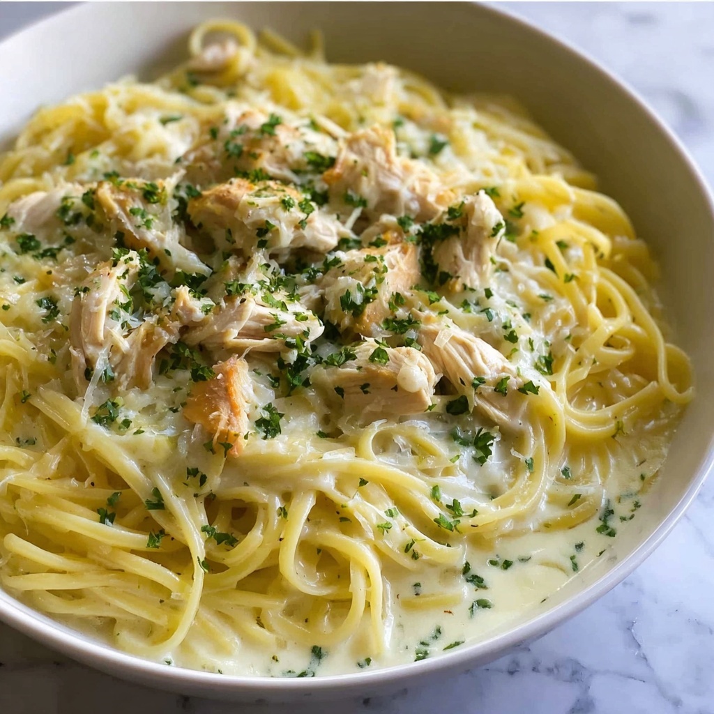 A delightful Chicken Spaghetti dish featuring tender shredded chicken tossed in a zesty lemon butter sauce, topped with creamy burrata cheese and fresh parsley. This quick and flavorful meal is perfect for a comforting weeknight dinner.