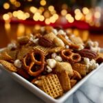This Christmas Eve savory snack mix is a flavorful and crunchy blend of pretzels, mixed nuts, popcorn, and cheese crackers, seasoned with a blend of olive oil, garlic powder, onion powder, smoked paprika, and salt. It’s baked to perfection for a warm, toasty snack that’s perfect for holiday gatherings or simple snacking.