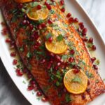 - Garnish and Serve: Transfer the salmon to a serving platter and garnish with pomegranate seeds, orange slices, and fresh rosemary or thyme sprigs for a festive presentation.