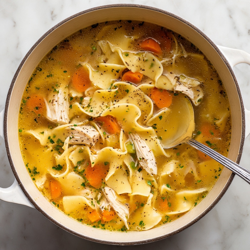 Carefully remove the chicken breasts and set them on a cutting board to cool just enough to handle. Shred the chicken meat with two forks, discarding the bones and skin. Return the shredded chicken to the pot — this step ensures every bite has tender morsels swimming within the soup. Season the broth with salt and pepper to taste, balancing savory and aromatic notes. Finally, add in the egg noodles, cooking according to the package instructions, usually about 6 to 8 minutes, for that perfect chewy texture. Remove the bay leaves and thyme sprigs before serving, leaving behind only their essence.