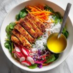Divide the mixed greens among your serving plates, layering on the sliced strawberries, mandarin oranges, thin red onions, toasted nuts, and optional cheese crumbles. Arrange the crispy coconut chicken strips on top, then drizzle generously with the warm honey mustard vinaigrette. Serve right away to enjoy the full contrast of warm chicken and cool, crisp salad that makes this Coconut Chicken Salad with Warm Honey Mustard Vinaigrette Recipe so wonderfully refreshing.