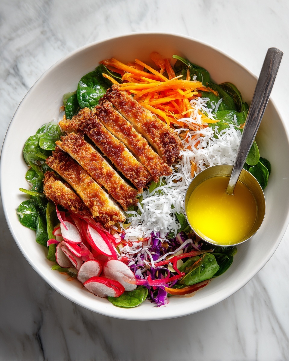 Don’t be intimidated by the ingredient list; each item is straightforward yet essential in building the layers of flavor and texture that make this dish so delightful. Every component—from the crunchy coconut coating on the chicken to the bright fruit and the warm, tangy vinaigrette—plays a special role in the overall harmony of this salad.