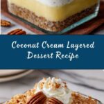 This Coconut Cream Layered Dessert features a buttery pecan crust topped with a creamy layer of sweetened cream cheese and whipped topping, followed by a luscious coconut cream pudding layer, finished with a fluffy whipped topping and toasted coconut sprinkle. Perfectly chilled, it’s a rich and indulgent treat ideal for gatherings or a special dessert craving.