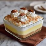 This Coconut Cream Layered Dessert features a buttery pecan crust topped with a creamy layer of sweetened cream cheese and whipped topping, followed by a luscious coconut cream pudding layer, finished with a fluffy whipped topping and toasted coconut sprinkle. Perfectly chilled, it’s a rich and indulgent treat ideal for gatherings or a special dessert craving.
