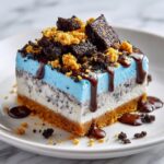 Cookie Monster Cheesecake is a fun and vibrant dessert featuring a rich and creamy blue cheesecake loaded with chocolate sandwich cookie crumbs, mini chocolate chips, and cookie chunks. Perfect for kids and adults alike, this American classic combines a buttery cookie crust with a colorful, smooth filling, topped with whipped cream and extra cookies for a delightful presentation.