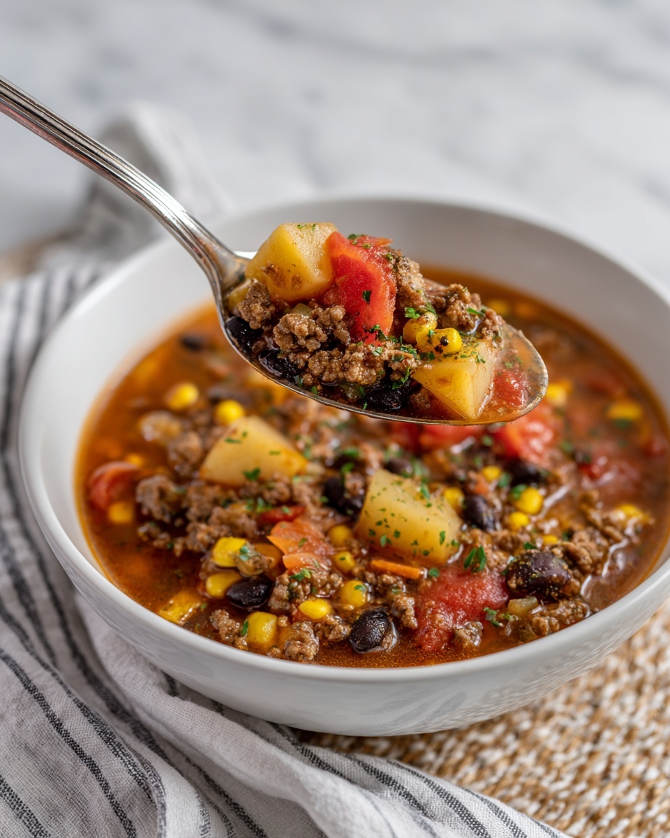 Cowboy Soup is a hearty, flavorful one-pot meal loaded with ground beef, beans, corn, and tomatoes, seasoned with chili powder, cumin, and paprika. Perfect for a comforting dinner, this easy-to-make soup simmers on the stovetop to meld robust southwestern flavors, making it a family favorite.