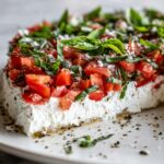 Generously spoon the marinated tomato bruschetta over the smooth cheese layer. The colors alone are inviting—the reds of the tomatoes, greens of the basil, and creamy white base create an irresistible visual appeal that matches the flavor.
