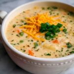 This creamy potato soup recipe features tender diced potatoes and carrots simmered to perfection, combined with a rich béchamel white sauce. Enhanced with garlic, parsley, and topped with shredded cheddar cheese and green onions, this hearty soup is comforting, flavorful, and perfect for a cozy meal.