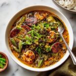 A rich and hearty Creole Shrimp and Sausage Gumbo featuring a deeply browned roux, the classic ‘holy trinity’ of vegetables, bold Creole spices, and tender shrimp and andouille sausage. This traditional Louisiana-style gumbo is slow simmered on the stovetop to develop complex flavors and is perfect served over steamed white rice with fresh green onions and parsley garnish.