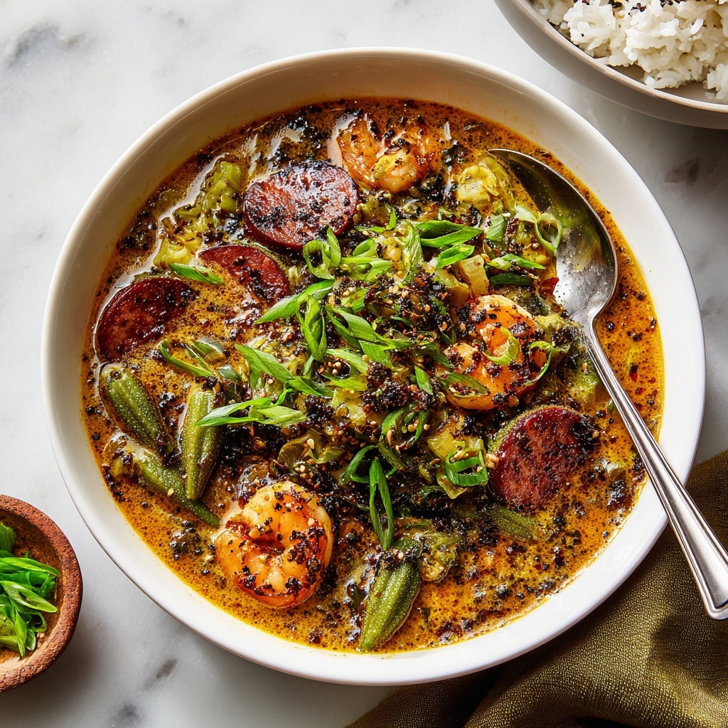 - Serve: Ladle the gumbo over cooked white rice and garnish with chopped green onions and parsley. Serve hot and enjoy this comforting Creole classic.
