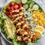 Arrange your chopped lettuce or a blend of butter and Romaine lettuce on a large platter or bowl. Artfully lay out sections of blue cheese, crumbled bacon, sliced eggs, avocado, sweet corn, cherry tomatoes, cucumber, and red onion in true Cobb salad style—each ingredient gets its own spotlight to create a beautiful mosaic of colors and flavors.