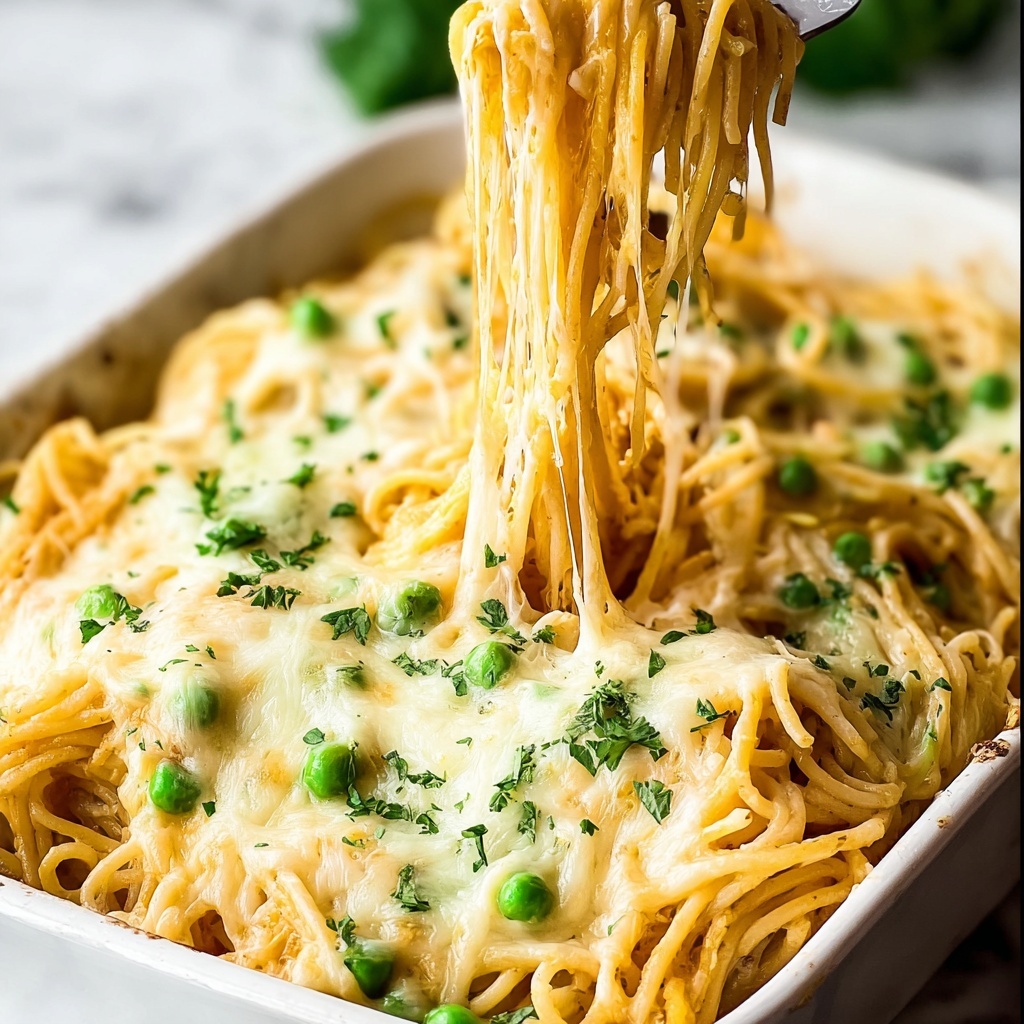 Next, stir in the peas, your seasoned cooked chicken, and the cooked spaghetti. Toss gently but thoroughly so each ingredient becomes luxuriously coated in that creamy sauce. This step ensures that every bite is bursting with flavor and comfort.