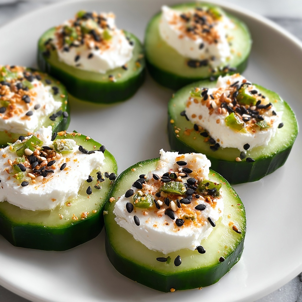 These cucumber bites pair wonderfully with a crisp white wine or a sparkling water infused with lemon and mint. To create a full appetizer spread, serve alongside smoked salmon, olives, and crusty bread for that everything bagel vibe taken to the next level.