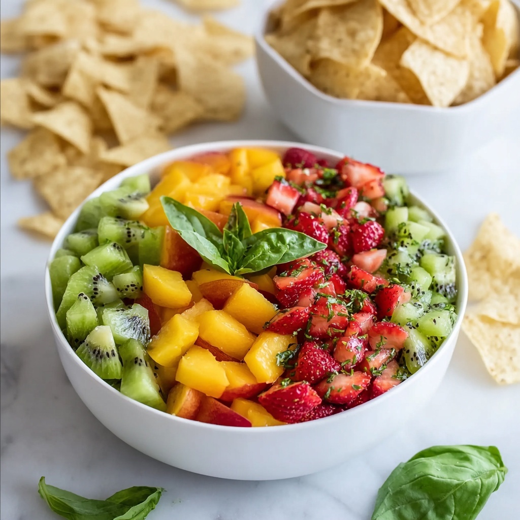 A refreshing and vibrant fruit salsa served with homemade cinnamon tortilla chips, perfect for a light snack or a healthy dessert. This recipe combines a medley of fresh peaches, mango, kiwis, and strawberries, tossed with a honey-lemon dressing and fresh basil. The crispy cinnamon chips baked from tortillas add a sweet and crunchy contrast.