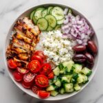 - Assemble the bowls: Divide the cooked cauliflower rice or quinoa evenly among four bowls. Top each with sliced grilled chicken, halved grape tomatoes, chopped cucumber, kalamata olives, and sliced red onion. Add a dollop of tzatziki sauce and sprinkle crumbled feta cheese on top. Squeeze fresh lemon juice over each bowl to brighten the flavors.