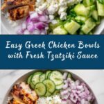A flavorful and healthy Greek Chicken Bowls recipe featuring marinated grilled chicken served over cauliflower rice or quinoa, topped with fresh vegetables, kalamata olives, tzatziki sauce, and feta cheese. This dish combines vibrant Mediterranean flavors for a wholesome and satisfying meal perfect for lunch or dinner.