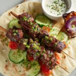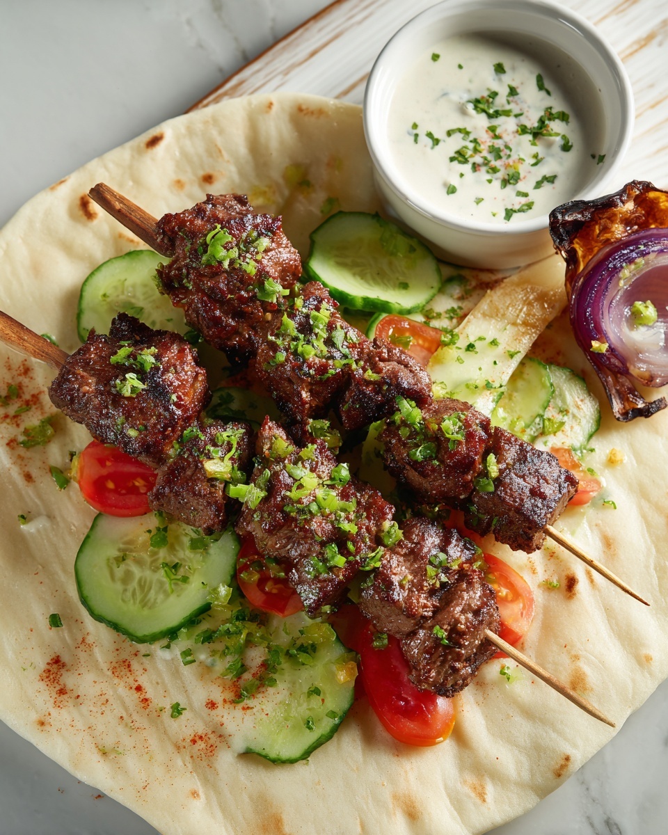 For a meat-free version, try marinated halloumi cheese or grilled vegetable skewers with the homemade pita—they’re just as delicious and satisfyingly smoky.