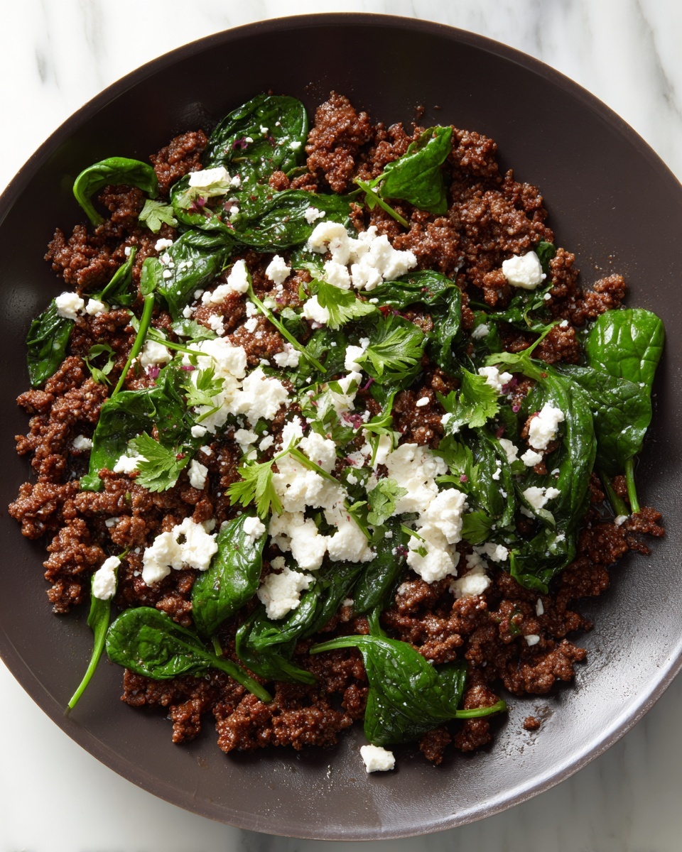 Remove the skillet from heat and sprinkle the crumbled feta cheese evenly on top. The residual warmth will gently melt the feta, adding a luscious, creamy tang that perfectly balances the savory beef and earthy spinach.