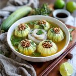 For a charming presentation, serve the stuffed melons and meatballs individually in deep bowls, ladled with broth. You might also sprinkle some fried shallots on top for a delightful crunch. Offering small bowls of soy sauce or chili sauce allow guests to tailor each bite to their preferred taste.