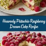 Heavenly Pistachio Raspberry Dream Cake is a luscious layered dessert featuring a moist pistachio sponge cake, a tangy homemade raspberry gelée, and a creamy sweetened cream cheese frosting. Finished with white chocolate chips and garnished with extra pistachios and fresh raspberries, this cake is a perfect balance of nutty, fruity, and creamy flavors, ideal for special occasions or an indulgent treat.