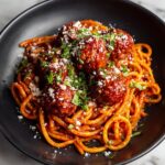 - Stir and Serve: Stir the cooked spaghetti gently to mix it with the meatball tomato sauce. The sauce will thicken as the pasta absorbs it. Serve immediately, garnished with additional grated Pecorino Romano cheese and fresh basil if desired.