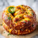 These Jalapeño Cheese Stuffed Pretzels offer a perfect combination of soft, chewy pretzel dough with a spicy, melty jalapeño cheese center. Crisped to golden perfection in a baking soda bath and baked to a delightful finish, they are an irresistible snack or appetizer with a flavorful kick.