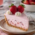 - Garnish and Serve: Before serving, garnish the pie with dollops of whipped cream or additional whipped topping and scatter fresh strawberries on top for added freshness and decoration. Slice the pie and serve chilled.