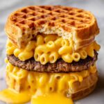 A fun and indulgent twist on the classic cheeseburger, featuring juicy grilled beef patties sandwiched between crispy, cheesy macaroni and cheese waffles. This creative comfort food combines rich cheddar flavors with a satisfying waffle texture to elevate your burger experience.
