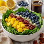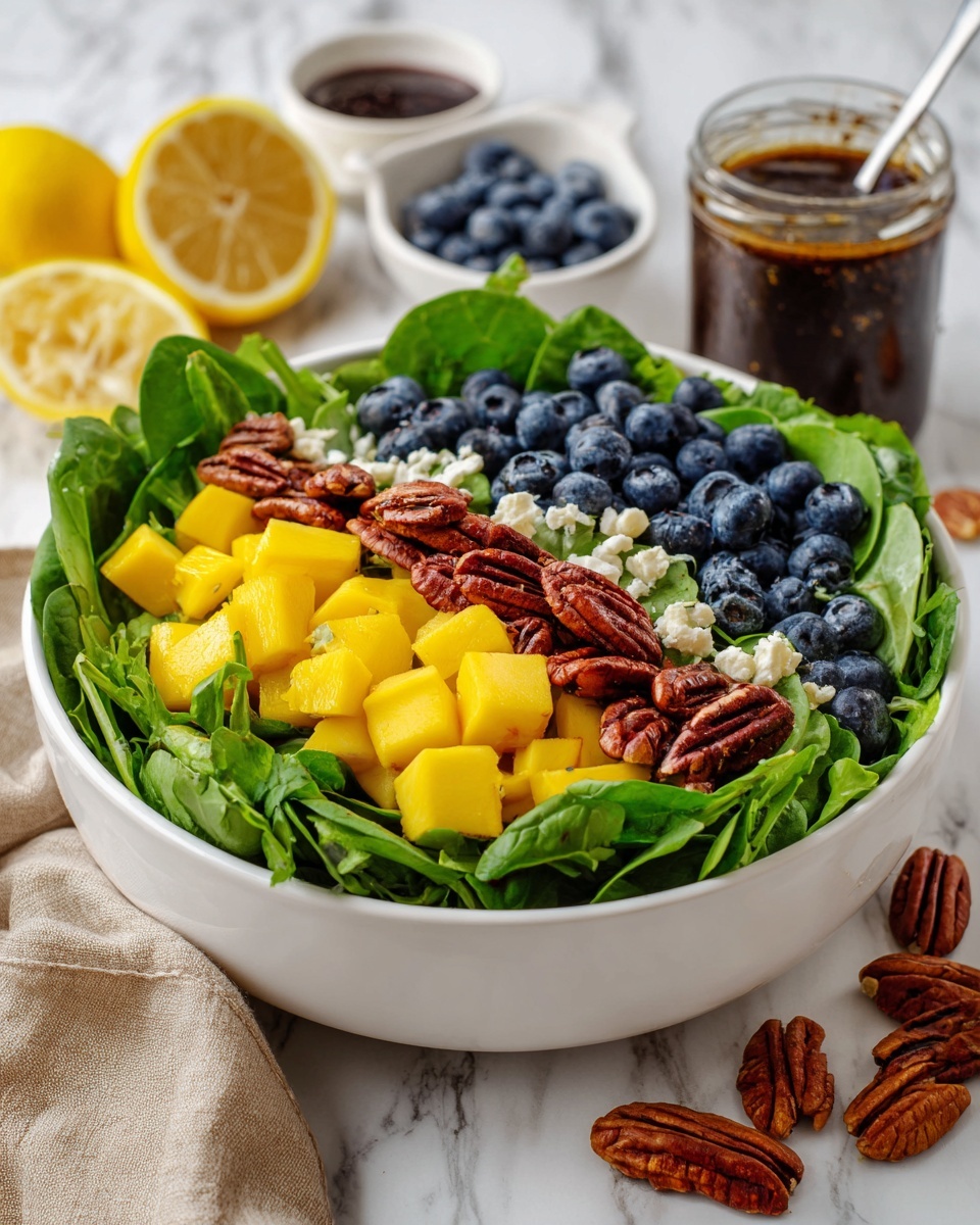 - Combine Salad Ingredients: In a large salad bowl, add 5 cups of fresh baby spinach, diced mango, fresh blueberries, thinly sliced red onion, crumbled feta cheese, and chopped pecans or walnuts. Gently toss these ingredients to mix evenly.