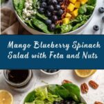 A refreshing and nutritious Mango Blueberry and Spinach Salad featuring fresh baby spinach, juicy mango, and sweet blueberries, topped with tangy feta, crunchy nuts, and a light balsamic honey dressing. Perfect for a quick, healthy, and flavorful vegetarian meal or side dish.