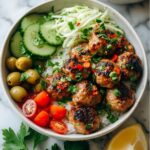 These Mediterranean Chicken Meatballs are a flavorful and healthy dish featuring lean ground chicken mixed with sun-dried tomatoes, feta cheese, and aromatic herbs. Baked to perfection, they offer a tender texture with a deliciously salty and tangy taste, perfect served alongside pita, rice, or a fresh Greek salad. This recipe is quick to prepare and makes for a satisfying Mediterranean-inspired meal.