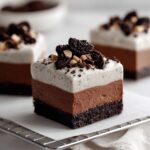 No-Bake Chocolate Mousse Bars are a creamy, decadent dessert featuring a chocolate cookie crumb crust topped with a fluffy semi-sweet chocolate mousse. These easy-to-make bars require no baking and are chilled until firm, making them perfect for a quick yet elegant treat that can be prepared ahead of time.
