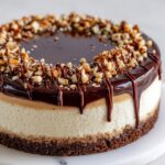 Sprinkle the top with mini chocolate chips and Reese’s Pieces candy for that irresistible, festive look. Finish with a generous drizzle of chocolate syrup to tie all the flavors together. Finally, chill the whole cheesecake in the refrigerator for at least 4 hours or ideally overnight, so it fully sets and all the flavors meld beautifully.