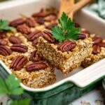 Allow the oatmeal breakfast bake to cool for several minutes so it firms up, making it easier to cut into squares. This cooling step is key to getting perfect portions that hold together when served warm.