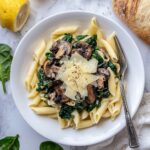 - Cook the Pasta: Transfer the mushroom and spinach mixture to a serving plate and set aside. In the same pan, add the dry pasta along with 3 cups of water and a generous pinch of salt. Bring to a simmer and cook, stirring occasionally, for about 10 minutes until the water is absorbed and the pasta is al dente.