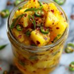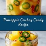 Pineapple Cowboy Candy is a sweet and spicy preserve made by simmering fresh pineapple and jalapeño peppers in a tangy syrup of apple cider vinegar, sugar, and lemon juice. This vibrant, flavorful condiment adds a bold kick to sandwiches, burgers, and cheese boards.