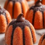 Once firm, lightly butter your hands to prevent sticking, then roll the chilled mixture into small, bite-sized balls. Roll each in granulated sugar to achieve that sweet, sparkly coating. Using a toothpick, press gentle ridges around each truffle to mimic the classic pumpkin grooves. Top each with a chocolate chip to create the charming pumpkin “stem.”