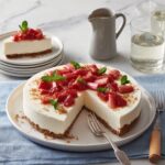 This cheesecake pairs wonderfully with fresh berries or a scoop of vanilla ice cream for balance and indulgence. If you’re aiming for a less sweet option, a simple green salad with a citrus vinaigrette offers a fresh counterpoint that cleanses the palate and complements the dessert’s close friend, rhubarb.