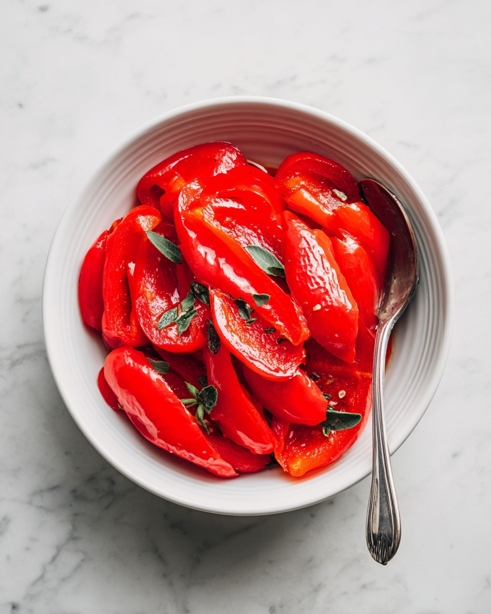 Start by charring the red bell peppers evenly over a gas flame or under a hot broiler. Once the skin is blackened all around, transfer them to a covered bowl or sealed bag to steam for about 10 minutes. This steaming helps loosen the skins, making peeling a breeze. After peeling, remove the seeds and slice the peppers into thin, delicate strips. This process unlocks their sweet, smoky flavor and tender texture.