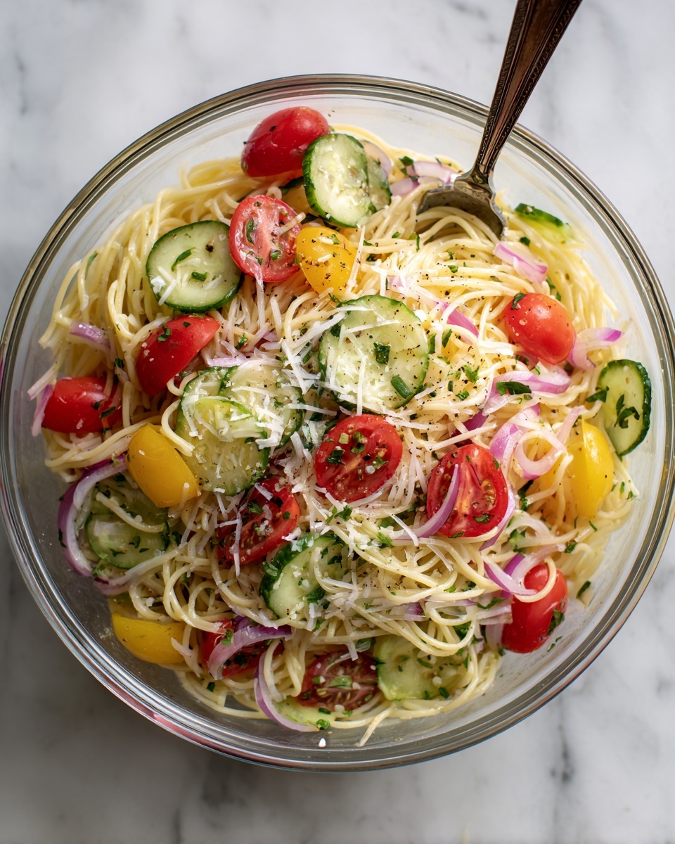 A refreshing and colorful Spaghetti Salad perfect for a quick lunch or a delightful side dish at gatherings. This easy-to-make salad combines cooked spaghetti with fresh vegetables, black olives, and a zesty Italian dressing, all topped with shredded Parmesan cheese for extra flavor. It’s refreshing, light, and packed with vibrant textures and tastes.