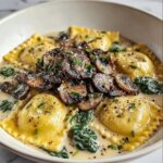 This Spinach Mushroom Alfredo Ravioli recipe features homemade pasta filled with a savory mixture of sautéed spinach and mushrooms, ricotta, and Parmesan cheese, served in a creamy, luscious Alfredo sauce. The dish is perfect for an elegant dinner or special occasion and combines fresh ingredients with classic Italian flavors for a rich, comforting meal.