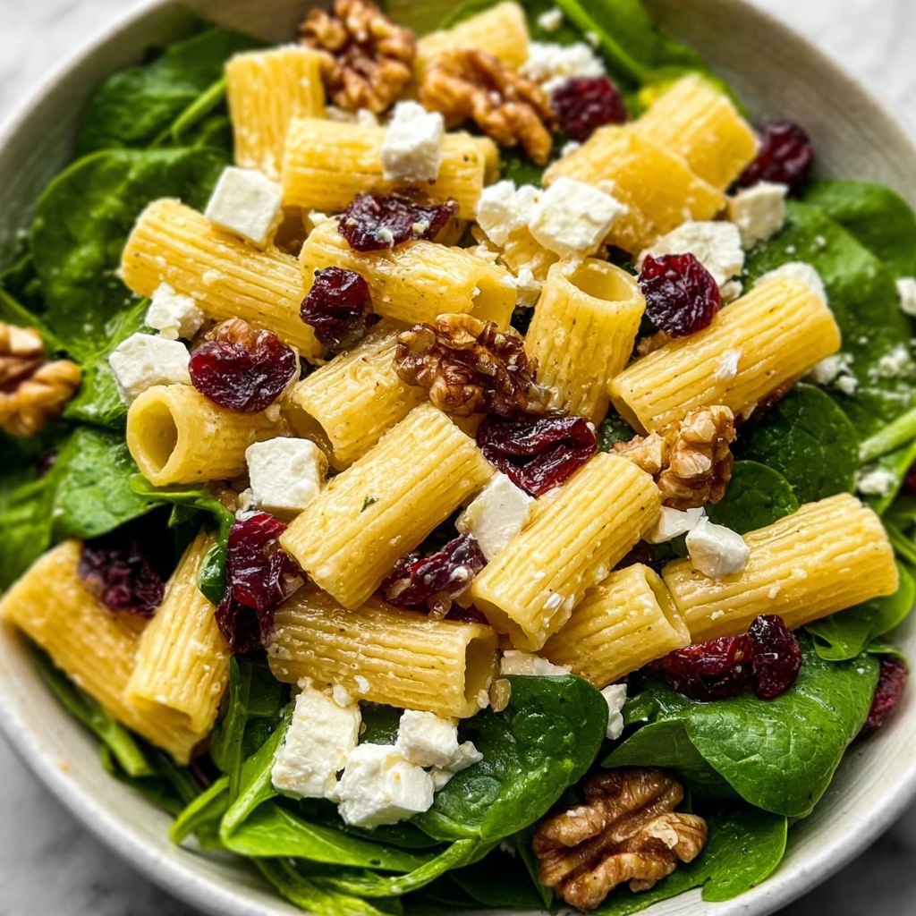 - Combine Salad Ingredients: In a large bowl, mix the cooled pasta with fresh baby spinach, dried cranberries, crumbled feta cheese, chopped red onion, and the chopped nuts if using.