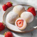 You can freeze these mochi treats, but it’s best to do so before assembling the fresh strawberries. Freeze both the whipped oat cream–filled strawberries and mochi dough separately. When ready to enjoy, thaw the strawberries slightly and quickly wrap them in fresh mochi dough for the best texture and flavor.