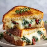 This Sun-Dried Tomato, Spinach, and Ricotta Grilled Cheese is a flavorful and comforting sandwich combining creamy ricotta, melted mozzarella, savory sun-dried tomatoes, and fresh spinach between crispy, buttery sourdough bread slices. Perfect for a satisfying lunch or main course, this Italian-inspired grilled cheese offers rich textures and bold flavors in every bite.